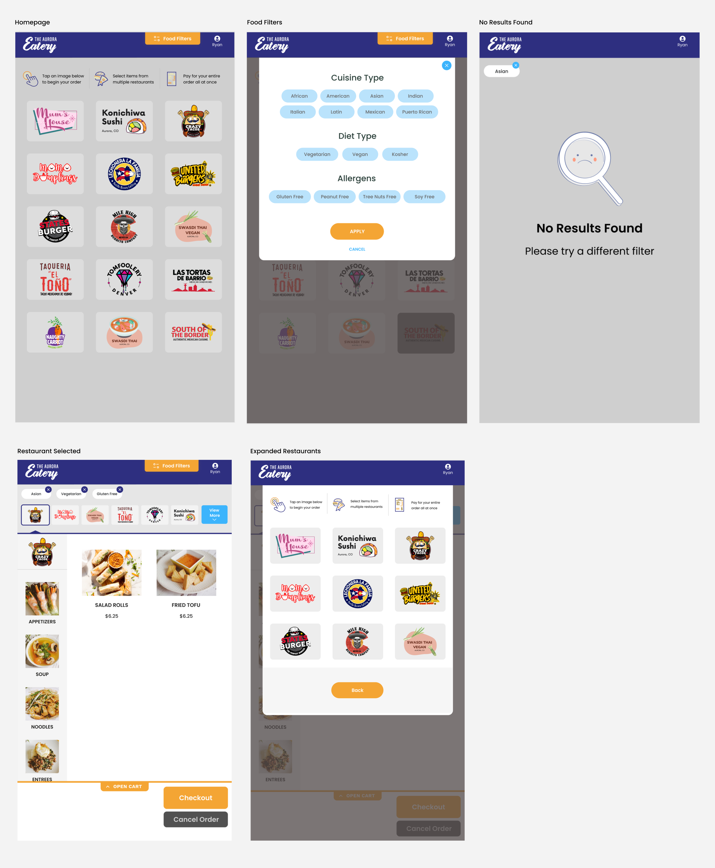 This concessionaire kiosk was developed based on a request from The Aurora Eatery. Due to a tight timeframe, the design process had to skip the sketching and wireframing phases. The previous concessionaire mode resulted in longer ordering times, as customers had to navigate multiple restaurants with diverse cuisines while also considering allergies and special dietary needs. Furthermore, since the concessionaire mode concept is new, many customers are unaware that they can place orders from multiple restaurants simultaneously and complete the payment in a single transaction.