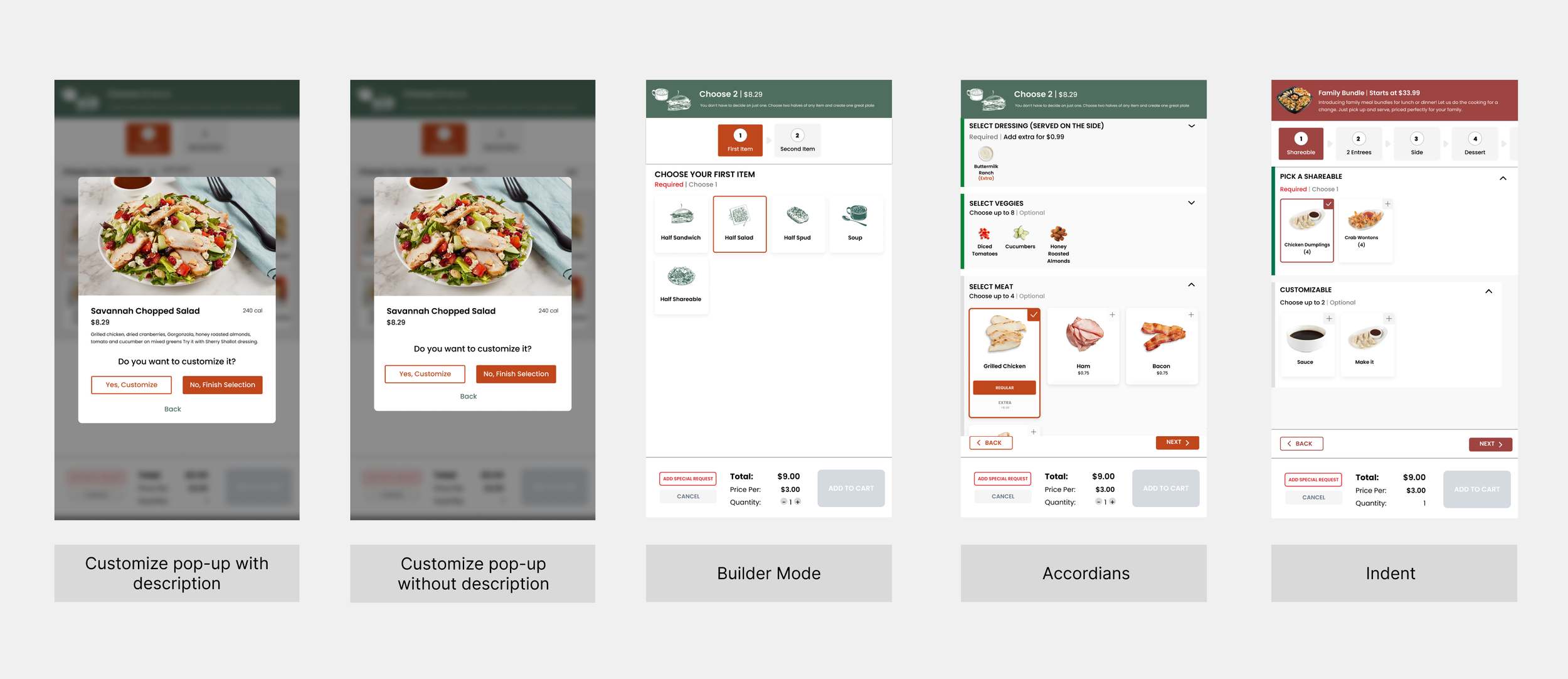In this case, the top banner shows the user the two stages that must be completed before placing an order, indicating that the item is in builder mode. In addition to our variant buttons, which are accessible on the dressing and allow customers to select multiple sizes without navigating to another page, this scenario also utilizes indented accordions, as illustrated in all the modifiers under the 'Choose Your First Item' section.