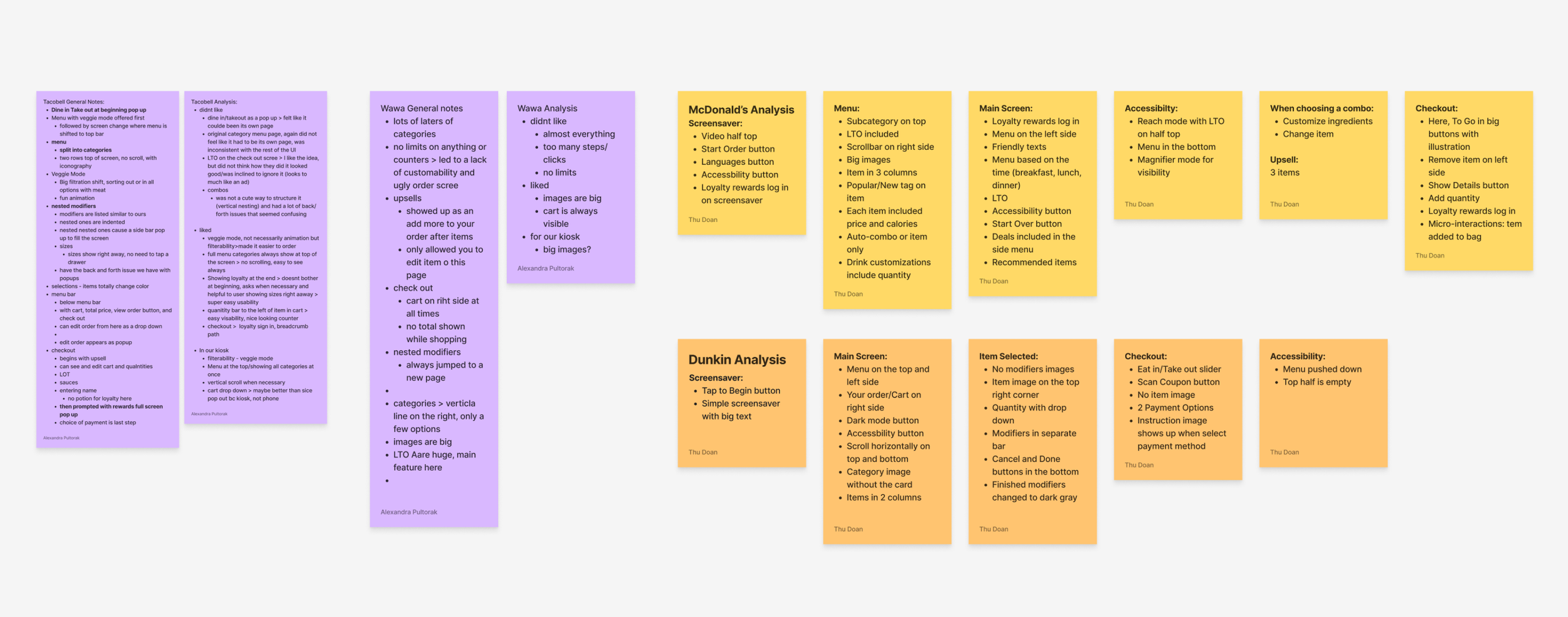 After researching the competition, we brainstormed essential features for the kiosk. We compiled a list of functions that should be included on the primary screens of the existing system while also adding features that would benefit customers. Our goal was to demonstrate how simple and quick it is to order from the kiosk, encouraging more customers to utilize our products.